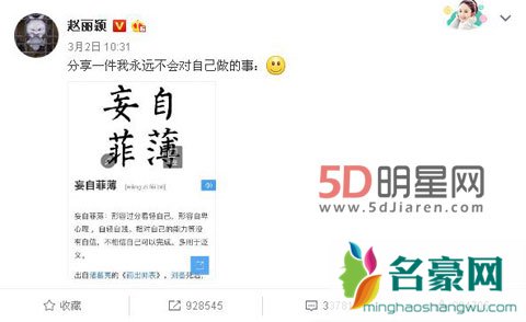 3月2日,赵丽颖在微博上发文,称分享一件我永远不会对自己做的事,随后附上一张写着妄自菲薄及带有妄自菲薄解释的图片。在该图片中的文字部分,对于妄自菲薄清晰的解释道,妄自菲薄,形容过分看轻自己,形容自卑心理,自轻自贱。指对自己的能力等没有自信,不相信自己可以完成。
