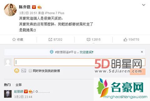 除此之外,赵丽颖还和近日陷于长胖新闻的陈乔恩带黑互动,3月2日,陈乔恩发微博回应关于自己的长胖新闻,称其实我这个人事很乐天派的,其实我真的没有那么胖,我轻的都要被风吹走了,是龙卷风,在陈乔恩此条微博发出后,赵丽颖在评论区补刀回复O。