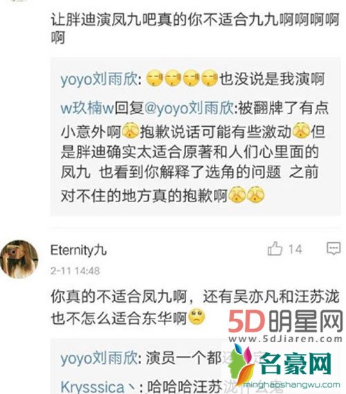 昨晚热播许久的电视剧《三生三世十里桃花》终于落下帷幕,正当观众们依依不舍之时,网上突然有一条消息炸开了,有位微博叫做“揭秘那些破事儿”的博主发图文称,刘雨欣赶热度购买了小说《三生三世枕上书》的版权,打算自己演凤九,并邀请吴亦凡或者汪东城扮演帝君,消息曝光后受到一大批剧迷们的抵制,纷纷前往刘雨欣微博下面询问真假,希望能让迪丽热巴与高伟光继续扮演凤九和东华帝君。