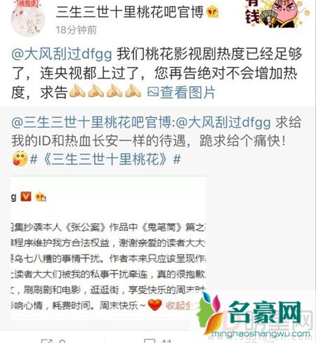就在大风刮过喊话《热血长安》的时候,另一部热播大剧《三生三世十里桃花》竟然公然叫板大风刮过“求给我的ID和热血长安一样的待遇,跪求给个痛快!”喊话一遍还不够,紧接着继续高调放话“我们热度已经足够了,央视都上过了,您再告也不会增加热度,求告。”广大吃瓜群众一脸懵逼,这是闹哪样,抄袭了还如此嚣张?还是本来没什么事跑来凑热闹呢?