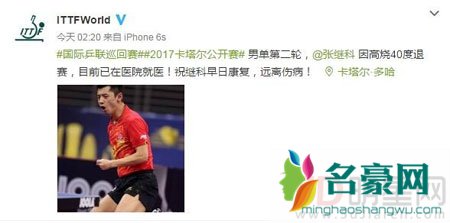 今天凌晨,原本是在零点40分进行张继科对丹羽孝希单打第二轮的晋级赛,不少球迷都等候在直播平台上准备一睹张继科的风采,准时出现在赛场的张继科熟练地进行赛前活动和练习,虽然看起来脸色略差,且之前已经直到从上一轮比赛结束之后就一直在发烧,不过看到他站在赛场上还是让人期待不已。然而比赛进行到开始没多久,由于身体实在支撑不住,双方选手握手结束这场比赛。得知张继科退赛之后,现场球迷都高喊“保重身体”,随后其本人也在脸书上宣布“因为还是高烧40度,所以只能决定退赛了,谢谢大家发来的关心与问候。”