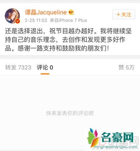 一大早,这一消息传的沸沸扬扬,直至中午时分,谭晶本人在微博中宣布“还是选择退出,将继续坚持自己的音乐理念”。此外,谭晶除了感谢观众对她的支持之外还为节目组送上祝福,希望节目可以越办越好。看上去似乎和节目组没有矛盾,但确确实实是退出了,截至目前,《我是歌手》尚未回应,谭晶本人也再无详细说明。