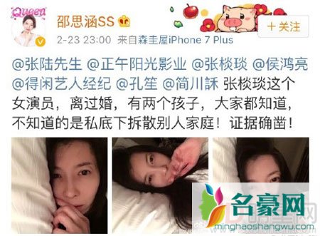 2月23日晚上,演员张琰琰在自己微博上发布状态:“不发微博,不直播的我合适吗?”随文晒出的三张躺在床上的自拍照显得格外的慵懒,性感,而随后曾在电视剧《欢乐颂》中出演王柏川一角的演员张陆妻子转发评论,并艾特了包括正午阳光官微以及其主要负责人的微博,控诉张琰琰做小三,勾引自己老公。并讽刺张琰琰自己不好好拍戏,婚姻失败,还让自己的孩子跟她学不到好的东西。此外,邵思涵更在其微博下大量评论,各种人身攻击让人有一种看到泼妇骂街的感觉。张琰琰本人曾在《琅琊榜》中饰演长公主,也曾在年轻时出演朱七七一角,是大家都很熟悉的女演员。