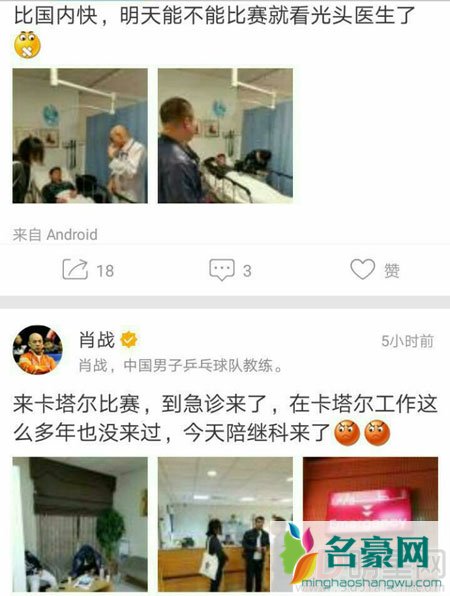 虽然首轮晋级令人感到高兴,但是随后刘国梁总教练的几条微博也让球迷的心瞬间悬了起来。据悉,在此次双打比赛之前,张继科就已经身体不适,原本就有脚伤的他赛前脚部浮肿严重,双打结束后又发烧到38度多,经过治疗和降温,张继科坚持要上场比赛,也是在现场球迷的加油和激励之下,藏獒还是发挥了一个战士的拼搏精神在这样的情况下拿下比赛。赛后,主管教练肖战也发博表示陪张继科前往医院急诊室救治,原来,赛前发烧并没有因为比赛胜利而被打败,反而上升到了39度,希望张继科能够早日康复,注意身体。