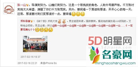 2月16日晚上,张一山微博发文祝福一下那谁和那谁,开开心心的每一天,还有,那谁要对我们家那谁好一点,要幸福!而与此同时,张一山还转发导演邓科的微博,并发文称导演我努力,山楂们我努力,这是一个有挑战的角色,人称外号葫芦娃。千万别对我抱太大希望,演砸了你们千万别骂我。