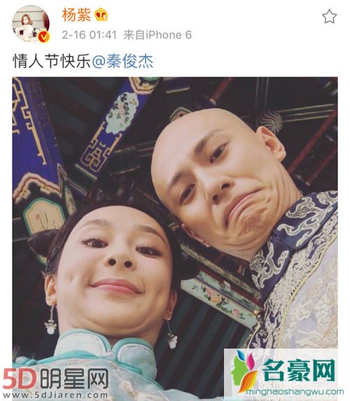 2月16日凌晨,被传恋情已久的杨紫开始在微博上晒出自己和秦俊杰的搞怪合照 照片中,穿着古装的两人自下而上的拍摄视角搞怪,杨紫艾特对方称“情人节快乐”,随后不久秦俊杰转发调侃:“我可能找了个假女朋友,前天是情人节,然后……为什么发我这么难看的照片。”自此两人正式公开恋情。