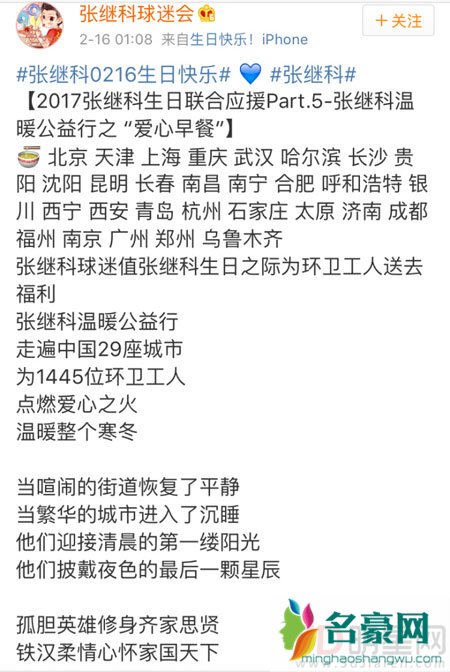 比起简简单单的一句生日快乐,球迷们更愿意用实际行动表达对偶像的喜爱,而早在几天前就已经在某报纸上刊登整版生日祝福的内容之后,球迷们也响应张继科正能量偶像的号召,用公益和慈善来为偶像庆生。据悉,在球迷会组织下,免费午餐、希望工程图书室、春蕾计划、联合国儿童爱心基金会等项目都以张继科的名义募集大量善款,帮助了许多需要帮助的人们。除了金钱方面之外,球迷们也身体力行的走上街头,为环卫工人们送上冬日的一份温暖问候,在全国29个城市展开爱心早餐的活动,这既是对劳动人民的一份心意,同时也借29这个数字寓意张继科29岁的生日。