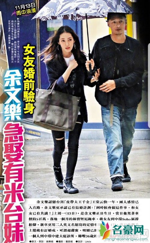 据悉余文乐女友日前现身诊所的时候曾被怀疑过有孕,不过后来辟谣是假新闻,而且她还多次被发现在余文乐浅水湾的家外出,像是已经同居,事后余文乐也承认二人已经有结婚的计划,所以说他们俩好事将近的日子应该也快了吧,近日余文乐和王棠云被拍到手上都带着戒指,就是不知道这戒指是不是婚戒呢?此外知情人称,喜欢逛夜店的余文乐现在更多时间放在陪女友身上,并且还买了一辆价值五百万的豪车,车牌号SS17也疑是两人英文名缩写,寓意为“余文乐王棠云在一起”。