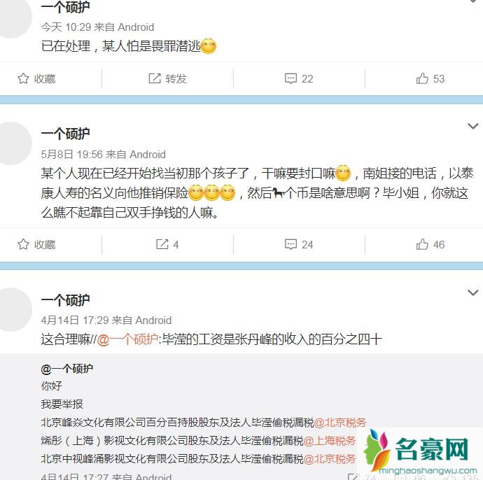 近日,毕滢偷税被实名举报,这究竟是怎么回事呢?现如今,网上关于毕滢偷税漏税的言论备受大家关注,毕滢偷税漏税和张丹峰有关吗?众所周知,两人是一起开的公司,如果毕滢偷税漏税的话,张丹峰会不知情吗?而网上爆料毕滢偷税的人究竟是谁呢?有人猜测举报毕滢偷税漏税的网友“一个硕护”是洪欣的人,这是真的吗?