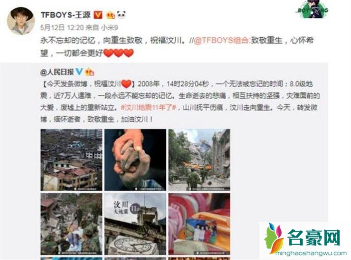 5月12日人民日报在微博发文缅怀汶川大地震的逝者,并号召网友转发,致敬重生,加油汶川!对此很多公众人物纷纷回应连连转发,但是王源却并没有直接转发,而是转发了一条四川凉山火灾30名消防员战士牺牲的微博,但是配文却是关于汶川的:“永不忘却的记忆,向重生致敬,祝福汶川”,此微博一出立即引发网友们的热议。