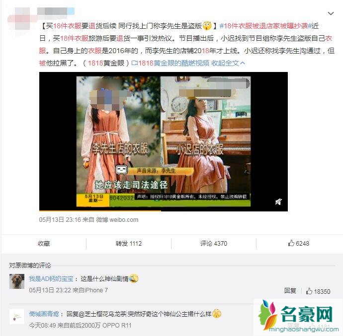 女子买衣服旅游后退货事件发酵之下,又有了新的消息,有位开淘宝店的小迟,特地从上海赶到杭州找到了@1818黄金眼 节目,说她有些情况要反映,因为这次的新闻,勾起了她的一段往事,而小迟表示,该理想三旬旅行女装店铺抄袭了自己原创设计。在迟小姐相关微博下方,也有网友表示,迟小姐是在“蹭热度”。