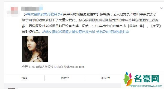 赵秀贤为什么自杀?据了解,韩国女星赵秀贤在家中吞食安眠药,企图想要自杀,对此震惊了不少网友,不少人纷纷猜测赵秀贤自杀的原因,有人称可能是韩国娱乐圈压力太大,最终赵秀贤顶不住压力,选择了自杀,究竟赵秀贤安眠药自杀是否如此呢?
