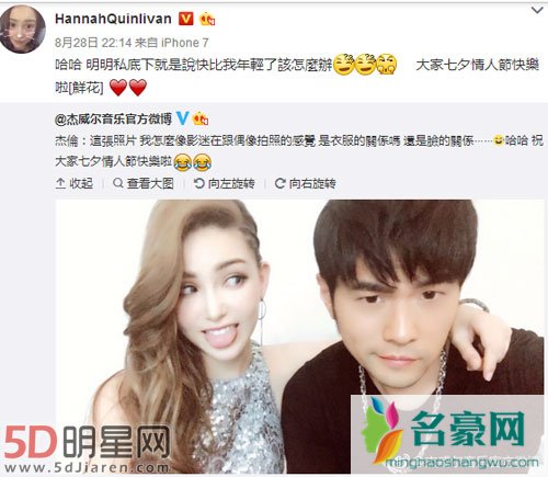 据台湾媒体报道,日前周杰伦在北京举行演唱会的时候,昆凌还一路相随陪伴着丈夫,演出结束后夫妻俩还被拍到前往上海共进晚餐的画面,而等到了8月28日七夕情人节这一天,每次都是被别人拍到合影的周杰伦昆凌自己终于也光明正大的秀了一次恩爱,罕见在脸书上放闪晒合影,并且配文称:“这张照片我怎么像影迷在跟偶像拍照的感觉,是衣服的关系吗,还是脸的关系...哈哈!祝大家七夕情人节快乐啦~”