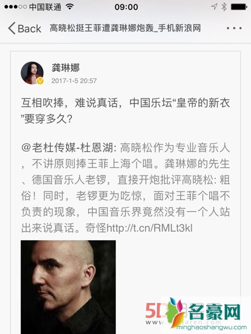 此前媒体人杜恩湖称“高晓松捧王菲上海个唱”,对于这种说法龚琳娜转发该媒体人的微博留言到:“互相吹捧,难说真话,中国乐坛“皇帝的新衣”要穿多久? ”令高晓松无辜躺枪,对此高晓松本人在1月6日发文回应,辟谣道:“有关王菲本次演唱会,我无论公开还是私下都没说过一个字,因为还没来得及看。蹭热点我理解,但是造谣就不好了。”