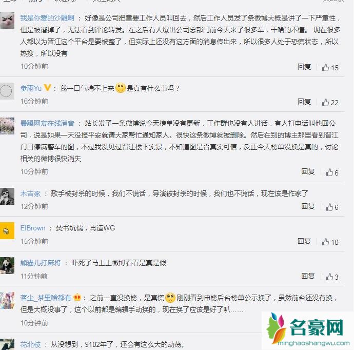 晋江文学城站长发文表示:今天不在公司,突然被打电话叫必须回公司一趟,问什么原因不说。然后登陆公司的内部办公系统,发现几乎所有的人都不在线,平时不断冒泡的聊天界面今天一直安静如鸡,编辑们该换的榜单也还没换。再想起之前同行的新闻,总党得同样或者更可怕的事情可能轮到晋江头上了。这就准备出发去公司,如果没事,回来报平安。如果有熟悉我三次元的朋友,今天晚上还没报平安,麻烦通知我家人帮我来照看猫狗。