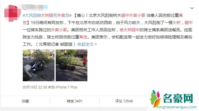 5月19日下午,在北京市白纸坊西街,由于风力较大,大风刮倒一棵大树,砸中一位骑车路过的外卖小哥。美团回应称,被大树砸中的骑士确系美团送餐员。经医院全力抢救,骑士终因伤势过重离世。美团表示,会和配送商一起全力做好后续保险理赔及善后工作。