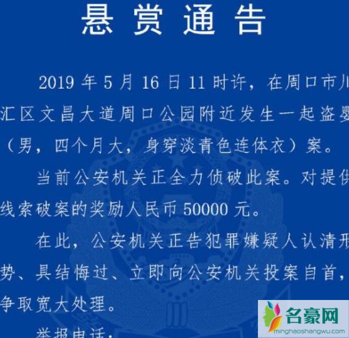 河南省周口市公安局官方微博消息,16日,河南文昌分局接到群众朱某报警称,其妻子带着四个月大的男孩子在周口市川汇区周口公园附近散步时晕倒(患有低血钾病,有晕倒史),醒后发现孩子失踪。目前,警方已立案调查。据河南省周口市公安局官方微博消息,2019年5月16日11时许,在周口市川汇区文昌大道周口公园附近发生一起盗婴(男,四个月大,身穿淡青色连体衣)案。当前公安机关正全力侦破此案。对提供线索破案的奖励人民币50000元。