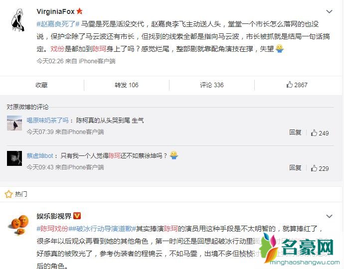 热播电视剧破冰行动导演道歉,昨晚电视剧大结局之后,豆瓣评分从8.0跌到7.5,大家都对结局十分不满意,导致破冰行动导演道歉之后,很多网友都在底下留言追问陈珂金主是谁,为什么阿珂可以疯狂加戏导致全片烂尾,而且在剧中一点作用都没有,阿珂为什么这么多戏?现如今网上还有关于阿珂戏份的热搜,可见大家对于阿珂戏份太多,也是十分的怨恨了。