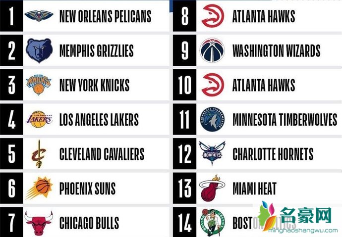 1.鹈鹕 2.灰熊 3.尼克斯 4.湖人 5.骑士 6.太阳 7.公牛 8.老鹰 9.奇才 10.老鹰(来自独行侠) 11.森林狼 12.黄蜂 13.热火 14.凯尔特人(来自国王)