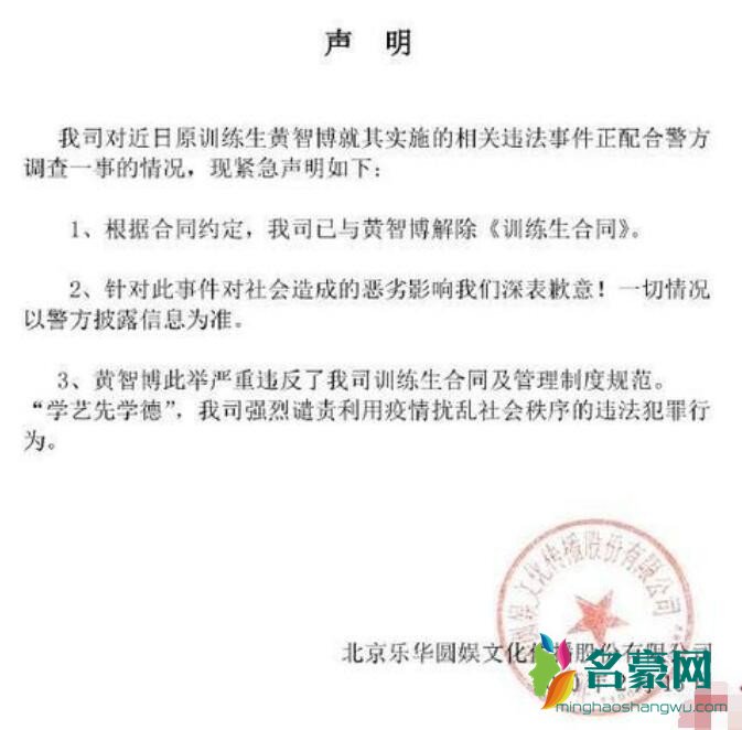 随后,上海公安局也公开了此事,黄智博利用疫情一事,以卖口罩名义实施的系列网络诈骗案,涉案金额达28万元。乐华娱乐发布“紧急声明”,称已与黄智博解除《训练生合同》并深表歉意,同时“强烈谴责利用疫情扰乱社会秩序的违法犯罪行为”。