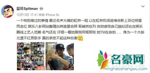 袁成杰在机场遇到两名自称粉丝的女子,袁成杰好心请客吃早餐并晒两女子照片,但是没有想到的是这一个举动却将那两名“虹桥一姐”给捧红了。原来袁成杰上当,“虹桥一姐”根本不是哪个明星的粉丝,但是每当在机场蹲点遇到明星便凑过去要求合影,但是却又不尊重明星,所以受到很多粉丝的气愤。但是没有想到最近不仅前有老戏骨王庆祥亲自到机场看“虹桥一姐”没被要求合影和自曝不红,后有苏醒表示很受伤。