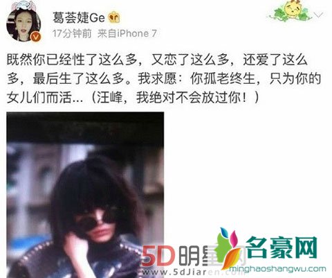 近日汪峰的前妻葛荟婕再次通过微博喊话汪峰,称绝对不会放过汪峰,愿汪峰孤老终生,只为了女儿们而活。这篇微博真是帮助一直想上头条的汪峰君完成了愿望,但是在此之前葛荟婕先喊话了章子怡,称这是自己的汪峰之间的战争,相信章子怡是一个善良有爱的人,会爱自己的女儿,但是因为对方太有名所以自己的世界里没有了颜色,并附上一张黑白的照片。对此网友们的意见不一,但是先让我们来看一下汪峰的情史。