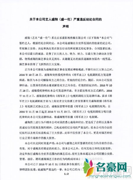 12月12日,乐漾影视发布了一条声明,表示自己旗下艺人盛一伦在被捧红之后便要求解约,不履行契约精神的,严重违约等行为已经造成双方不能共事,并已经将盛一伦告上法庭呼吁大家遵守契约精神同时保持行业内的良性竞争。但其实早在公司起诉盛一伦之前,盛一伦就已经上诉至朝阳区法院,对乐漾拖欠薪酬一事进行起诉。盛一伦说,自己从出道至今,公司安排的工作都有认真完成,但是所的片酬却一直拖欠,在自己多次催促的情况下公司才付给他一部分,剩下的一千万尚未支付,希望公司可以尽快将他应得片酬悉数奉还。与此同时,盛一伦还说自己的经纪人在未经自己知晓的情况下被公司强行辞退,重新更换的团队使得自己无法正常工作。