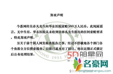 11月10日,复旦大学附属华东医院宣布在当天因为院方个别工作人员把吴亦凡的健康检查报告发到网上的消息,并同时声称由此泄露了吴亦凡先生的个人隐私信息,并给吴亦凡先生造成了伤害和困扰,由此严肃致歉,并一定会对此事件追查到底。医院及时的发布澄清新闻,并宣布一定会给事件当事人吴亦凡一个交代,也算是及时挽救了医院在公众心中的形象。