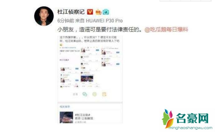 杜江否认出轨程潇事件始末,这次杜江突然被曝出轨程潇,唯一的根据是杜江曾与对方共同参加一档电视节目,在节目中曾夸女方很勇敢,结果就被人拿来造谣,实在不靠谱!杜江不让谣言过夜,当晚23点17分就发文回应“小朋友,造谣可是要负法律责任的”,吓得对方连夜删掉相关微博。