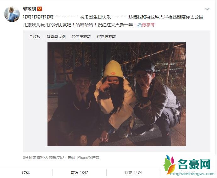 郭敬明为陈学冬庆生,郭敬明晒出与陈学冬、杨幂的合影,为冬冬庆生,写道“咚咚咚咚咚咚咚,祝冬哥生日快乐,珍惜我和幂这种大半夜还能陪你去公园撒欢儿玩的好朋友吧!祝红红火火新一年!”照片中三个人蹲在地上,比耶捧脸。随后陈学冬留言回应,“在新疆的我发来感谢评论”。连续几年除了14年没有发文,其他几年一直都有给陈学冬送祝福,感情很好,两人只是好兄弟关系。
