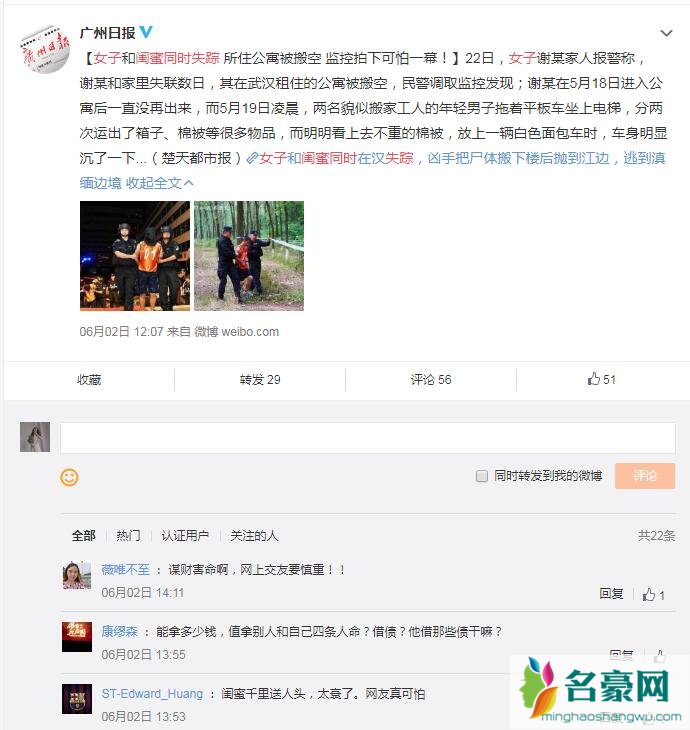 女子闺蜜同时失踪真相居然是被网友蓄意谋杀,据了解,侯某现年30岁,家住武汉市新洲区,家境本不宽裕,好逸恶劳,欠下巨额债务。他通过社交软件结识同样重债缠身的邢某后,开始通过网上交流策划犯罪。5月初,他们将目标锁定为在外租住的女网友谢某,并踩点和购买作案工具。