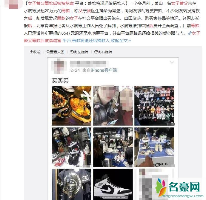 杭州萧山女子替父众筹后被指炫富是怎么回事?据了解,萧山一名女子替父亲在水滴筹发起20万元的筹款,称父亲被医生确诊为胃癌,向网友求助筹集善款。不少网友转发捐款之后,却发现发起筹款的女子在社交平台晒出买跑车、出国旅游、购买奢侈品等情况。