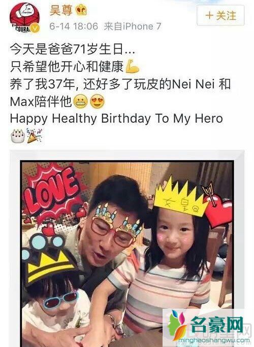 6月14日是吴尊爸爸71岁的生日,这一天吴尊特意在微博上晒出爸爸与自己的儿女三人合照,配文称:“只希望他开心和健康,养了我37年,还好多了玩皮的Nei Nei和Max陪伴他,Happy Healthy Birthday To My Hero。”吴尊爸爸生日粉丝网友当然也会在下面给予生日祝福,但万万没想到吴尊微博评论下面会是这种画风,“我还在找爸爸在哪?”“本来想叫爷爷的,看了图,还是改口叫叔叔吧。”“71岁!!!这也太年轻了吧,完全没看出来。”