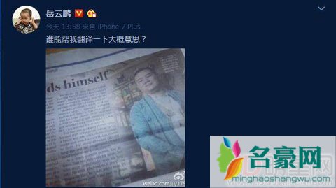首先是最近的时间中岳云鹏登上了国外的报纸上使得众多的网友对于报纸上写的东西各种的评论真的是十分的辣眼睛的样子,而说起来相声界除了郭德纲,最受欢迎的莫过于小岳岳岳云鹏了,小岳岳总是一个表情,一个肢体动作,就把大伙儿给乐得不行。其实说真的这位名叫岳云鹏的男士的微博也是十分的受到众多的网友瞩目的地方,而最近的时间中因为小岳岳登上报纸上的时候,使得这位男士在自己的微博中发了这样的微博。