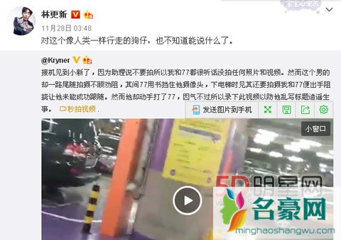 11月28日凌晨,林更新微博发文到对这个像人类一样行走的狗仔,也不知道能说什么了。而在林更新微博发出后,一度引起不少粉丝网友的围观,而看到之前林更新发的微博,粉丝们大概知道是发生了什么事,原来在11月28日林更新从飞机下到机场后,被一名狗仔一路跟拍。