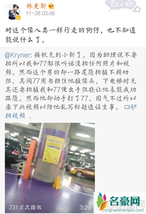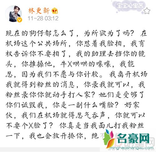 11月28日凌晨三点钟,林更新更新微博动态,发文炮轰狗仔怒斥其“为所欲为”,“现在的狗仔都怎么了,为所欲为了吗? 在机场这个公共场所,你怼着我脸拍,我有权告诉你不要拍了,我的助理去挡你的镜头,你推搡他,牛X哄哄的嚷嚷,我能忍,因为我们不愿与你计较。”本来大家还以为只是林更新不想被狗仔拍才会开怼,没想到接下来还有更过分的事情,原来在狗仔不听劝阻依旧拍林更新的时候,有一位女粉丝也想要拍狗仔,劝解他不要拍了,没想到却遭到对方动手,这可就引爆了林更新的暴脾气。