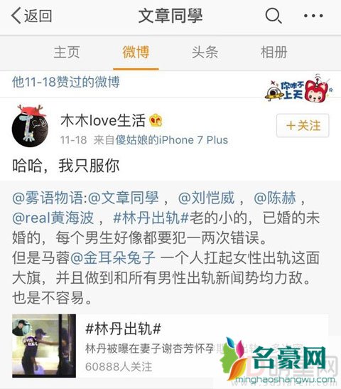 近日有一个网友在微博上发文称“老的小的,已婚未婚的,每个男生好像都要犯一两次错误,但是马蓉一个人扛起女性出轨的这面大旗。”从这几句就可以看出是在为马蓉辩解,站在马蓉这边的。但是这名发微博者不知是出于何种心态,居然还@了文章、刘恺威、陈赫、黄海波、林丹等一众有丑闻的人。就在众人都没有反应的时候,文章居然为此微博点赞了,并且至今都未取消。