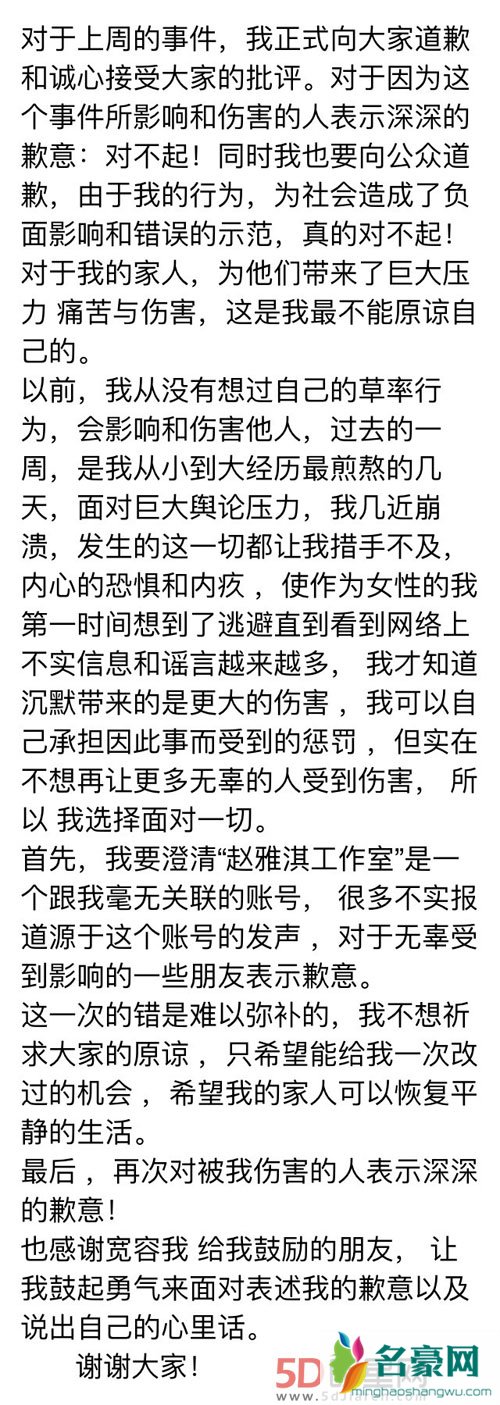 林丹出轨事件虽然过去了这么久,但外界对这件事的热议声却依旧不间断,近日出轨门的“小三”赵雅淇首度出面发声,在微博上晒出长文针对出轨事件道歉,长文中赵雅淇自称内心备受煎熬,真心像大家道歉,诚心的接受外界的批评,只是她的这番道歉显然并不被网友买账。