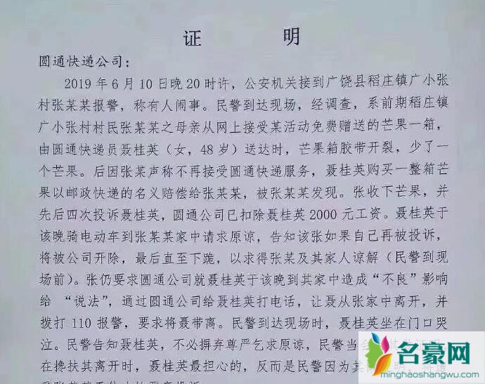 6月11日,一张落款山东省广饶县稻庄派出所的《证明》在网络流传,引发了社会关注。《证明》显示,稻庄镇广小张村村民张某某之母亲从网上接受某活动免费赠送的芒果一箱,由圆通快递员聂桂英(女,48岁)送达时,芒果箱胶带开裂,少了一个芒果,张某声称不再接受圆通快递服务。