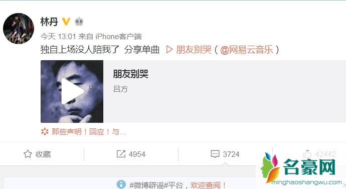 在得知李宗伟退役后,林丹发布微博称:独自上场没人陪我了,配了一首吕方的伤感歌曲《朋友别哭》。两人最近一次同框是在马来西亚公开赛上,林丹击败谌龙获得冠军,李宗伟现身为他颁发奖杯。