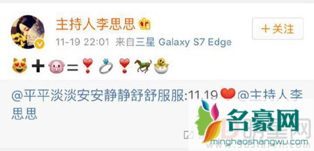 11月19日,主持人李思思转发了一位名为“平平淡淡安安静静舒舒服服”的博主微博,上面只是单纯的写着“11.19爱心”并艾特了主持人李思思,而李思思转发中也以一串奇怪的字符表达了一种特殊的情感,疑似宣布自己怀孕的消息,一个老虎加一头小猪等于一个小马一个小鸡。而据悉,早在2014年李思思就曾被传怀孕生子,根据这条微博显示,很有可能就是马年诞生的宝宝,而如今的小鸡则预示着今年再度怀孕。被媒体猜到谜底的李思思也随后发博宣布,自己在30岁的时候得到上天赐予的惊喜,也将会放下工作暂停脚步,做个平凡的母亲,迎接小生命的到来。
