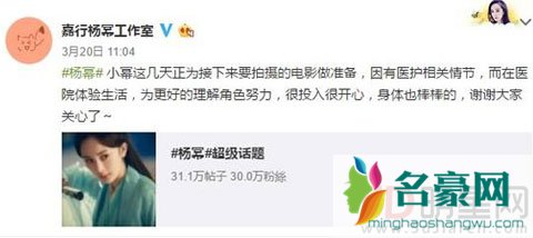 据了解杨幂被网友发现出现在南京市的某妇幼保健院,引发外界的怀疑,称有可能怀了二胎,但杨幂工作室之后为其澄清,称杨幂这几天都是为了接下来要拍摄的一部电影做准备,因为有相关的医护情节所以要到医院体验生活,这也是为了能够更好的理解角色而努力,她很投入也很开心,身体棒棒哒,谢谢大家的关心。目击者应该也是医院的工作人员,照片中杨幂穿着医生的绿色衣服,还为粉丝们签了名。