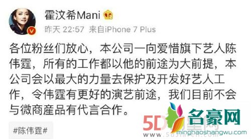 事件发生后被骂的惨不忍睹的霍汶希也出面做出回应,她声称让粉丝们放心,“本公司一向爱惜旗下艺人陈伟霆,所有的工作都以他的前途为大前提,本公司会以最大的力量去保护及开发好艺人工作,令伟霆有更好的演艺前途。”明确表示陈伟霆目前不会与微商产品有代言合作。但这番回应并未让粉丝放下心来,大家纷纷要求白纸黑字的写清楚,毕竟霍汶希这番回应背后还是有很多篓子可以钻的。