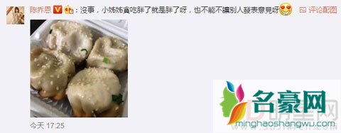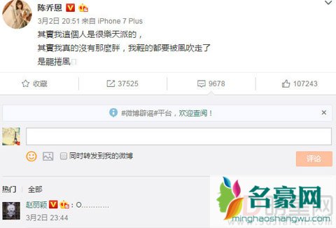 3月2日陈乔恩再次在微博上发表评论,称:“其实我这个人是很乐天派的,其实我真的没有那么胖,我轻的都要被风吹走了,是龙卷风。”这个直面自己体重又带有一定排比的幽默文章句子纯属是为了逗粉丝们一笑,也表现出陈乔恩阳光积极向上的心态。但无奈下面却被好友赵丽颖不痛不痒的补了一刀,发了一个令人浮想联翩的神评论“O”,是在说陈乔恩的身材像圆了,还是仅仅一个语气词呢,自己领会吧!