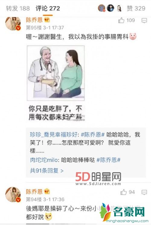 网上不断的吐槽令陈乔恩昨天还特意又发了一条微博,表示自己很乐天派,也真的没有那么胖,轻的都要被风吹走了,不过是龙卷风,这条微博下面网友纷纷留言表白,没想到还看到了赵丽颖本人的评论,赵丽颖变身“赵小刀”发了一个“O.....”,引发网友哈哈大笑。