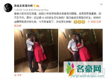 赛后,邹市明发微博感谢妻子,他说“世界冠军虽重要,但不及你,爱你。感谢大家的关注和祝福,回到21年的梦的原点感谢有你相随。”邹市明还表示此次由于备战没能陪妻子过一个好好的生日,但是这个金腰带也是自己送给冉莹颖最好的礼物,今天他拿到了,这个金腰带也是属于冉莹颖的。这个一直备受争议却始终站在邹市明身后坚定不移的支持老公的一些决定和事业的贤妻良母此刻也收获了全世界的爱。