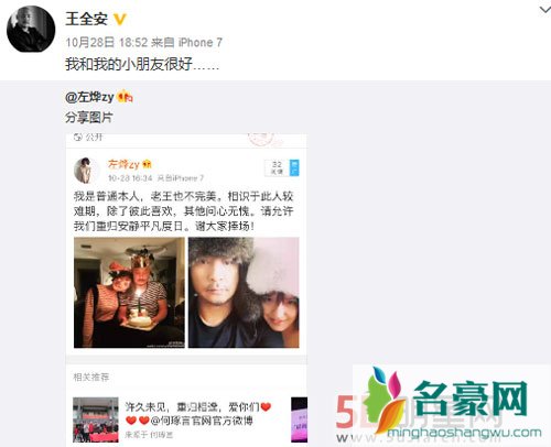 10月28日,王全安的小女友左烨在微博上晒出两张亲密合照,发文证实二人的恋情,左烨在微博中写道:“我是普通本人,老王也不完美。相识于此人较难期,除了彼此喜欢,其他问心无愧。请允许我们重归安静平凡度日。谢大家捧场!”随后王全安转发微博,配文称:“我和我的小朋友很好……”