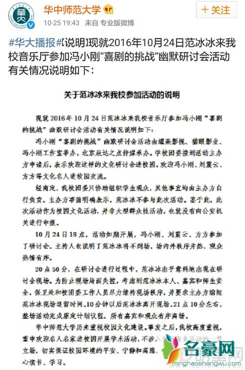 前段时间范冰冰在华师大宣传电影《我不是潘金莲》的时候遭遇突发事故,上台10分钟后她就被主持人给请下台,对此冯小刚导演称对方威胁:“如果不离场马上断电。”这件事当时引发了很大的热议,华师大方面和范冰冰工作室方面先后发表声明回应此事,校方解释事前不知道范冰冰会出席,因为“安全因素”才会请她先离开,并无恶意,而范冰冰工作室方则表示武汉媒体均已在事前得知范冰冰会现身的消息,现场也并未发生所谓的秩序问题,一时间支持双方的网友纷纷开始站队。