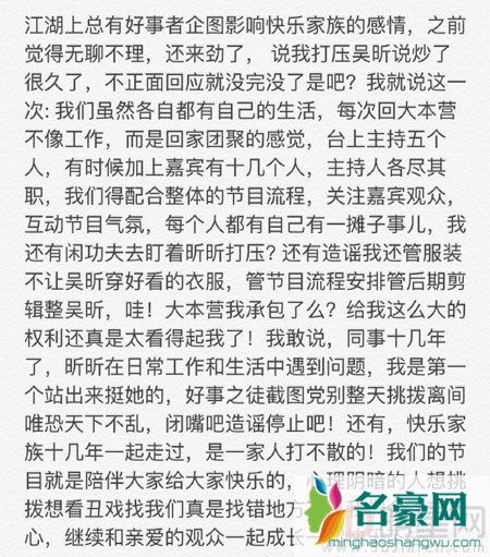 谢娜和吴昕都是快本的主持人,共事时间早已经超过十年,虽然吴昕是后来和海涛一起进入节目主持群的,一开始也一直是作为柱子一样的没有话语权配角。虽然这几年有所改进,但是比起活跃度相当高的谢娜来说,吴昕依然是一个每一场都可以被忽略的角色,也正因为这样,张扬的谢娜也经常被外界指责是她刻意打压吴昕。谢娜也在两天前的微博中发长文详述自己一直是和吴昕以好姐妹相称的,自己并没有那么大的权利可以掌控吴昕每一场穿什么,做什么,每个人都有自己的职责大家分工合作,并一直不忘初心,这才是快乐家族的全部。这些话也被网友转发,理解,但是对她的质疑却依然没有停止。