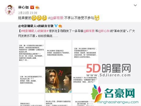 近日,由苏有朋执导,林心如、张鲁一、王凯共同主演的《嫌疑人x的献身》进入宣传阶段,而在宣传方面,《嫌疑人x的献身》官博放猛料,回顾了主演林心如和导演苏有朋二十多年的革命情谊,而在微博发出后,不少网友对于官博的回顾表示质疑,纷纷投稿,由此网友版林心如苏有朋革命情谊发布,引发大批粉丝网友前来围观。